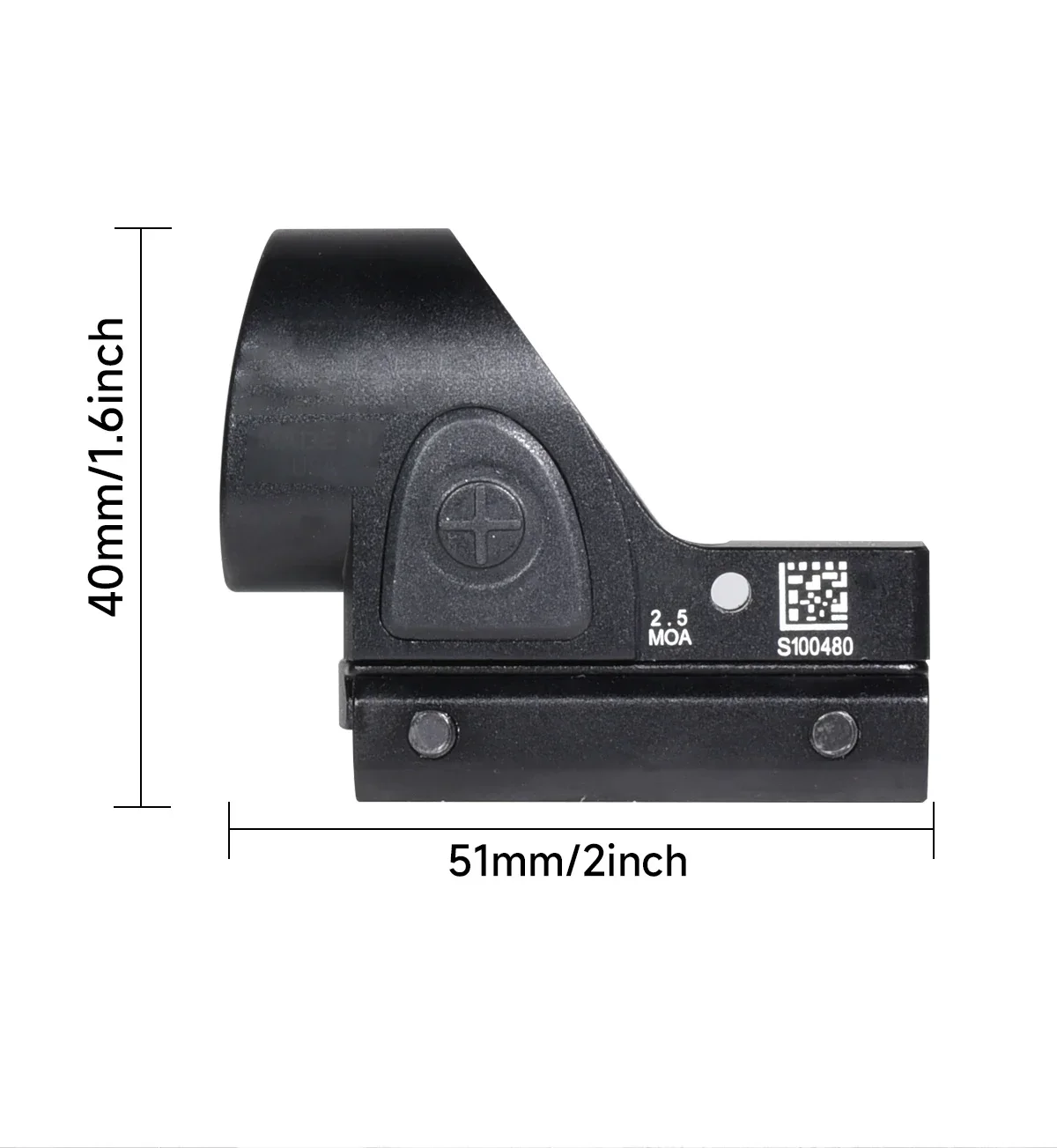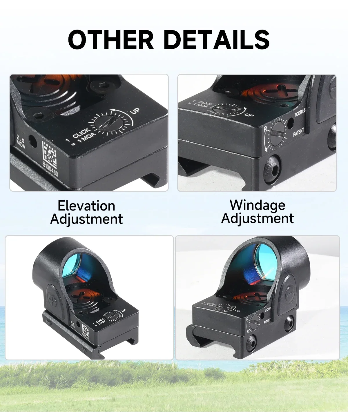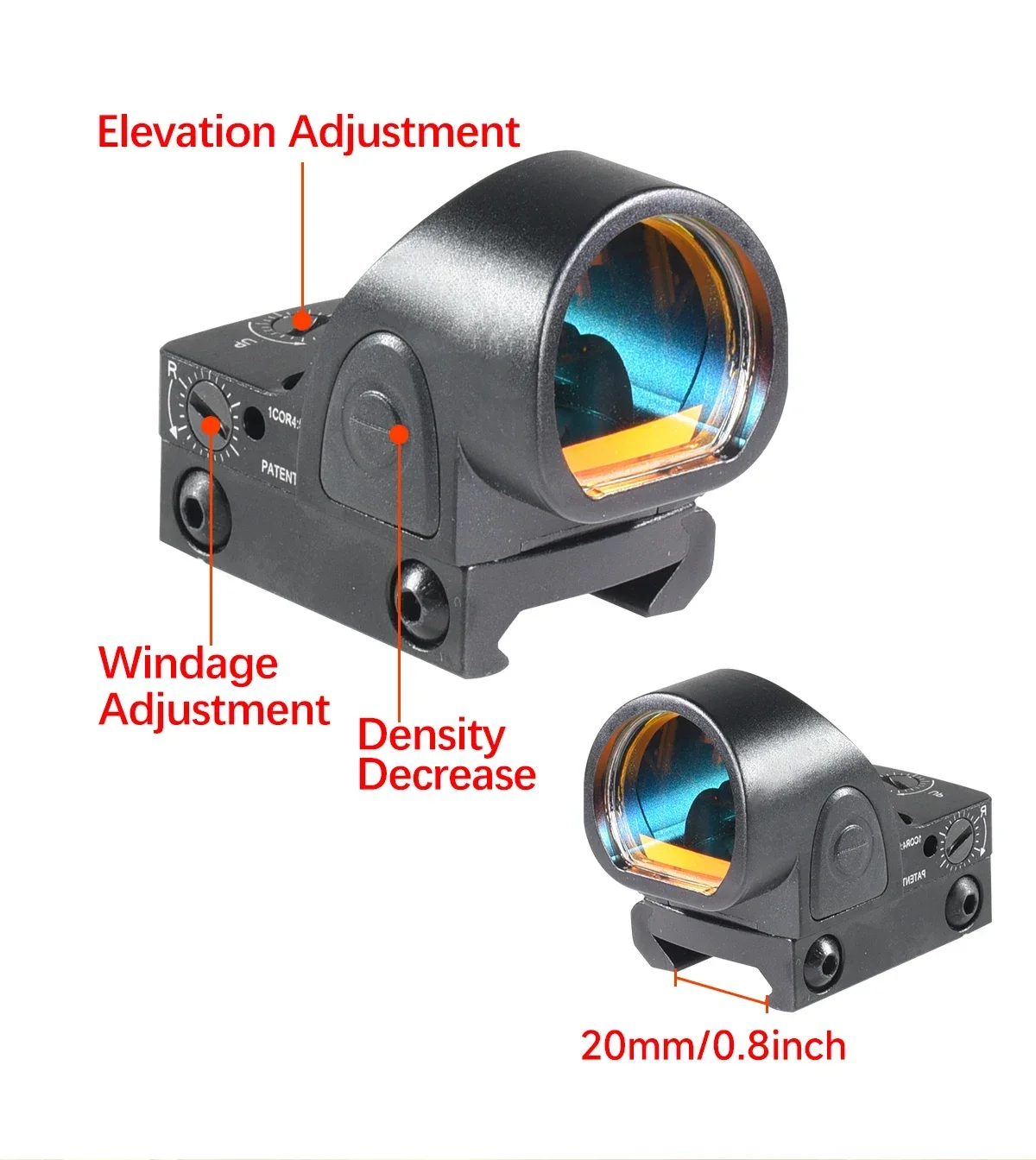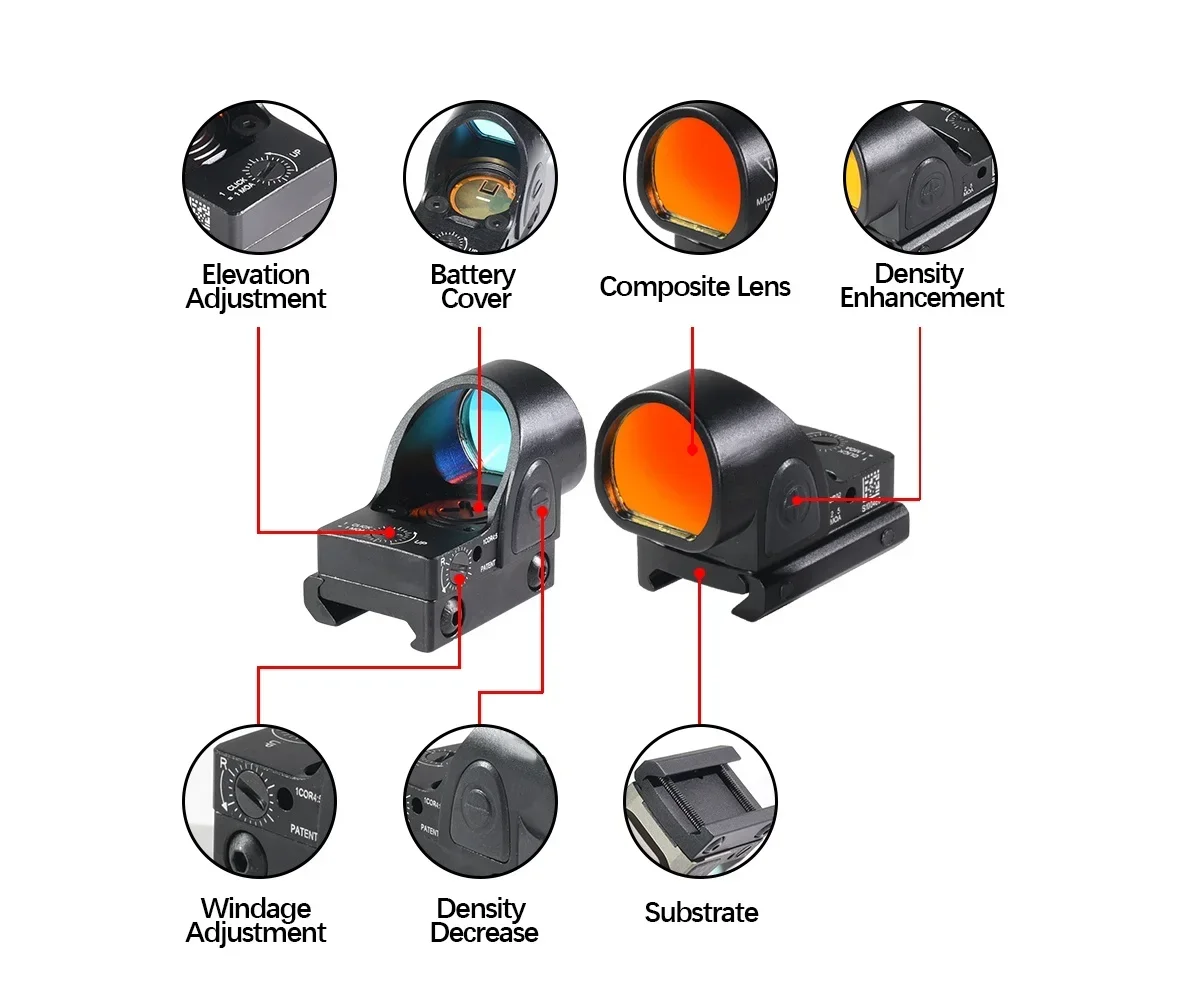 1 ,Including the Gl*ck mount and 20mm rail mount2,Material:Metal3,Precision CNC machining4,Surface hard anodized5,Reticle color Red6,Battery Type: CR2032 (not included)7,With five available brightness settings,8,the reticlecan be manually adjusted9,by pressing the plus orminus buttons10,on either side of the unit.