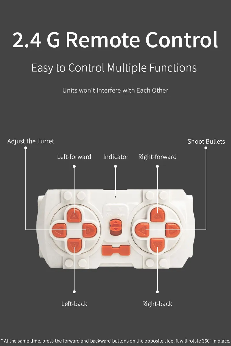 *At the same time, press the forward and backward buttons on the opposite side, it will rotate 360° in place.